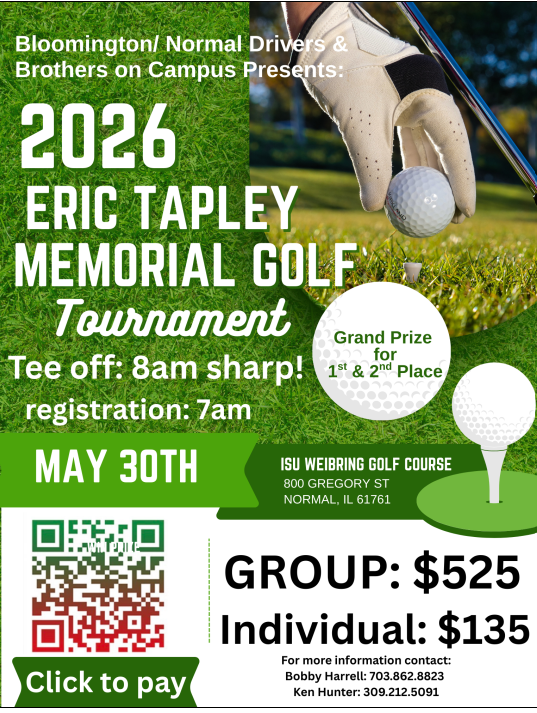 On Saturday, May 30th, 2026, the Brothers on Campus & Bloomington/Normal Drivers will host the Annual Scholarship Charity Golf Tournament at ISU WEIBRING GOLF COURSE.